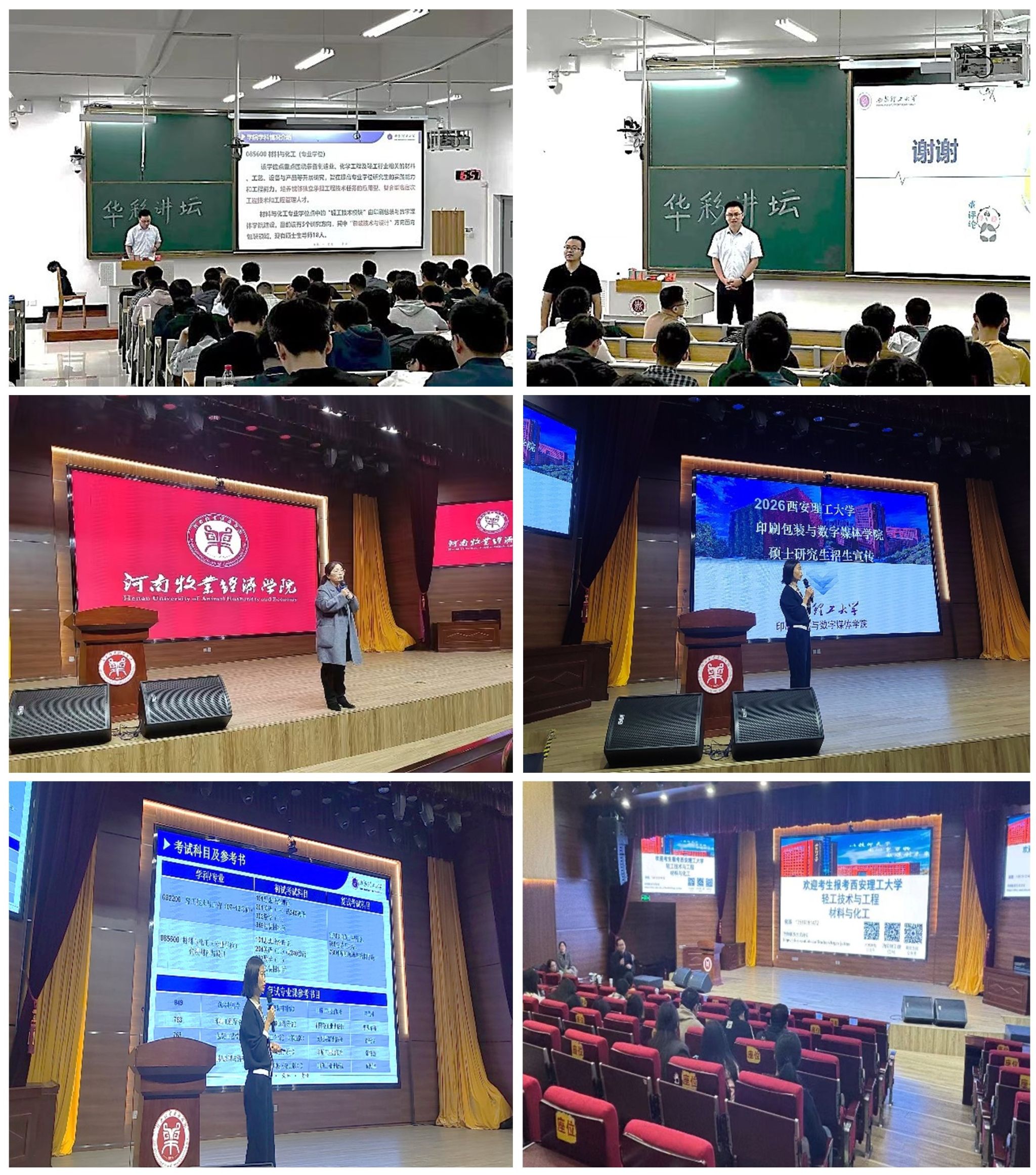 10月10日,包装工程系任鹏刚教授、系副主任任芳副教授,学科秘书裴璐赴河南牧业经济学院开展硕士研究生招生宣传,受到包装与印刷工程学院刘士伟副院长的接待。招生工作团队进行专场招生宣讲,与包装工程专业26届学生见面交流,裴璐老师从学校研究生招生培养概况,学院学科情况、学科导师三个方面向学生们进行了详细介绍,共同观看学院宣传片——《风华印包 数领未来》。任鹏刚教授、任芳副主任回答了学生们关心的问题,并预祝考研学子成功上岸,活动现场气氛积极活跃。